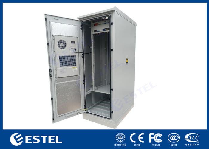 캐비닛에는 19 ′′ 장비 설치 래크와 배터리 선반이 포함되어 있습니다. 캐비닛에는 정문에 설치된 에어컨이 있습니다.
